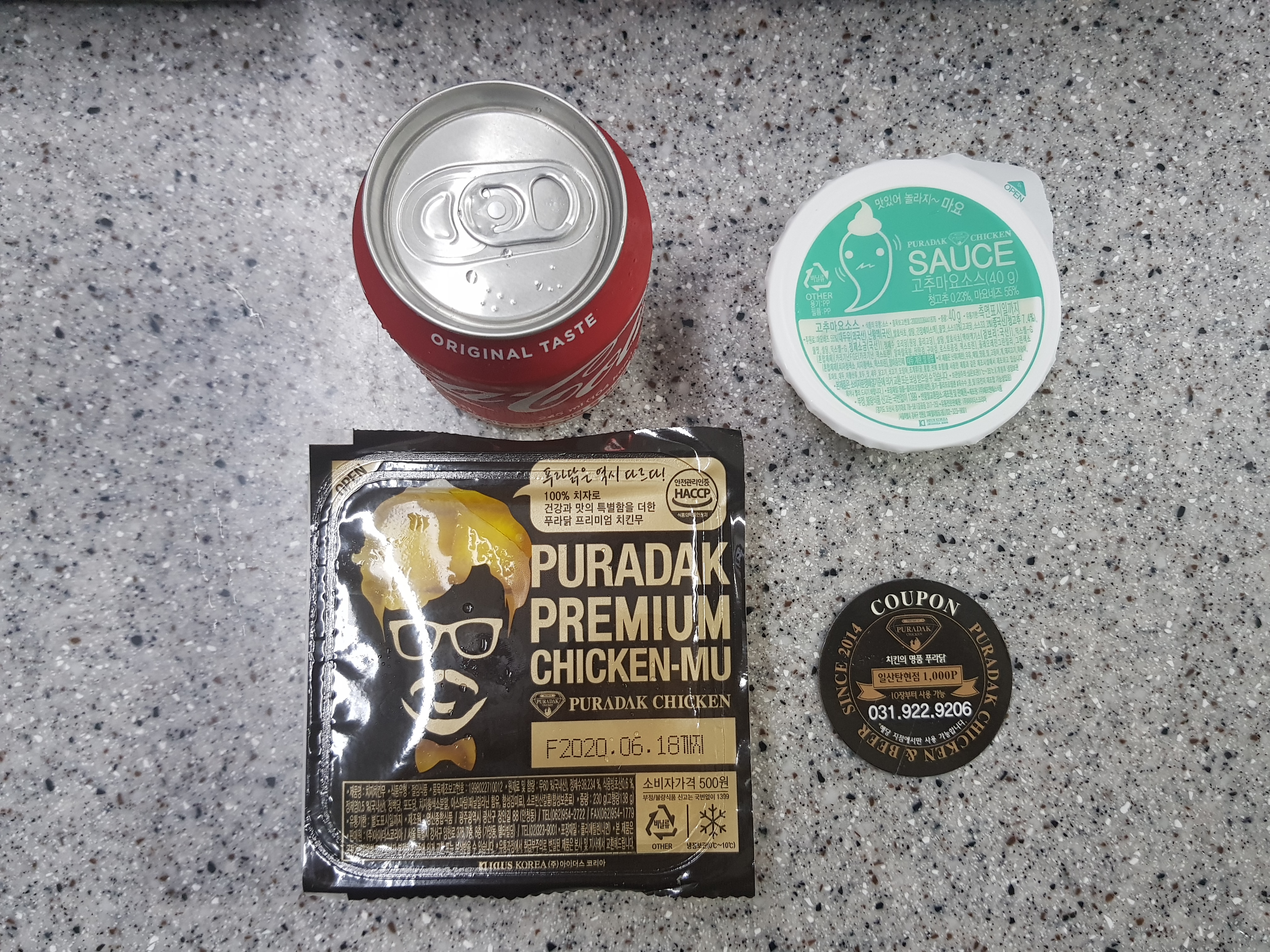 먼저 치킨 외 부속부터 살펴볼게요. 기본 캔콜라 1 pcs 제공되고요. 고추마요소스, 치킨무, 쿠폰1매입니다. (쿠폰은 10장 모으면 1마리 아닌 1만원 할인이네요~)