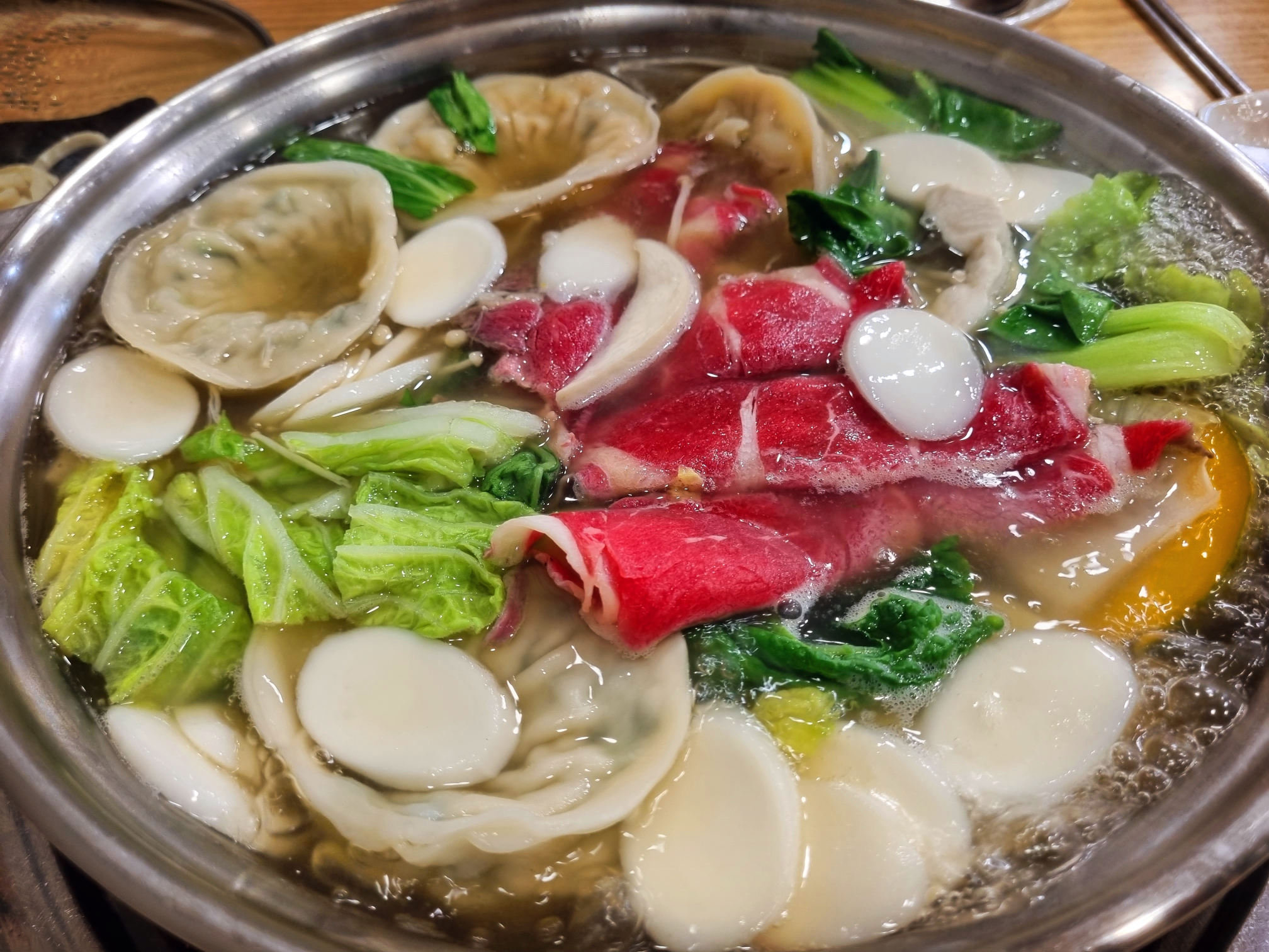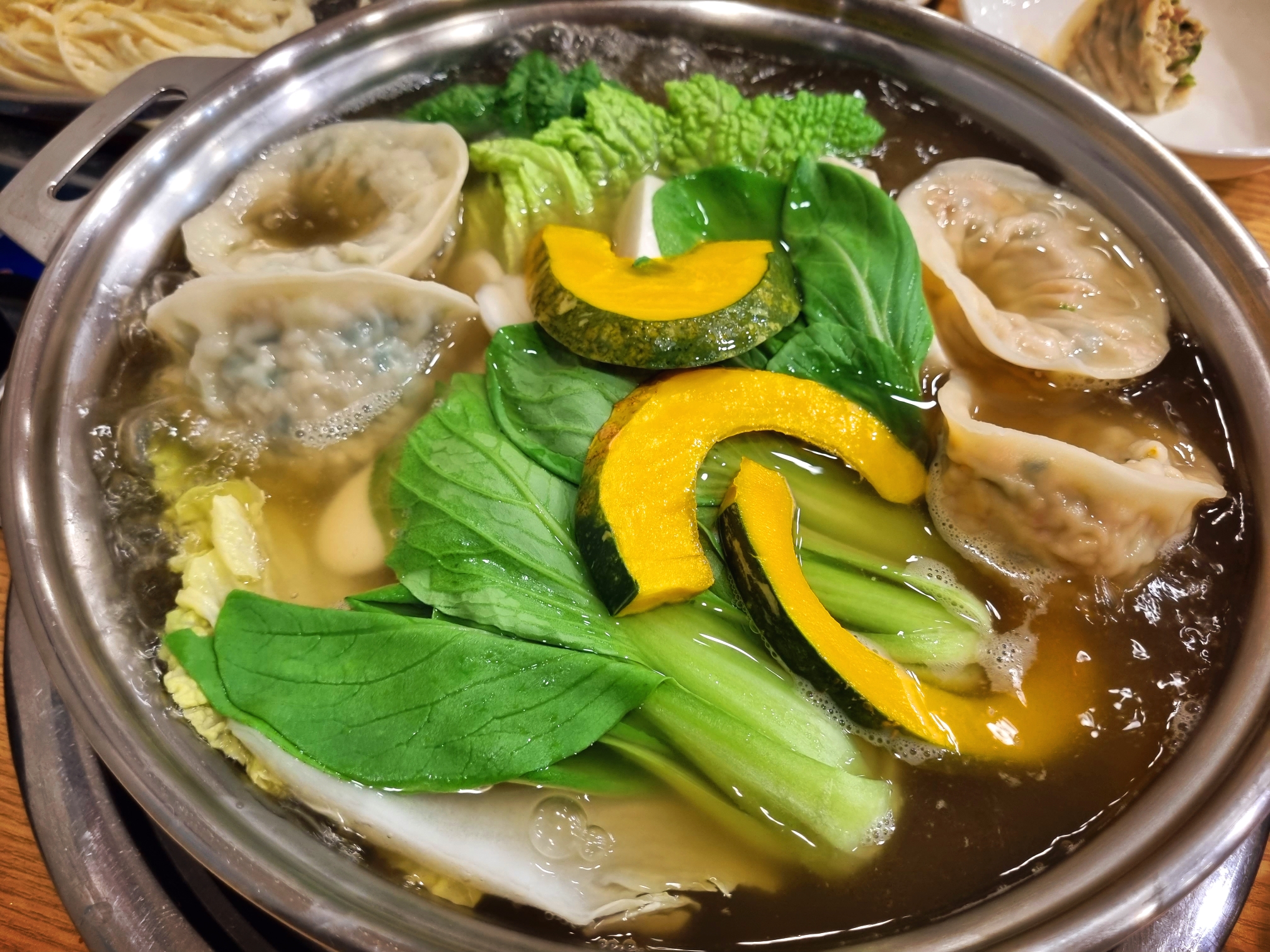 각종 채소와 만두 가득한 전골냄비